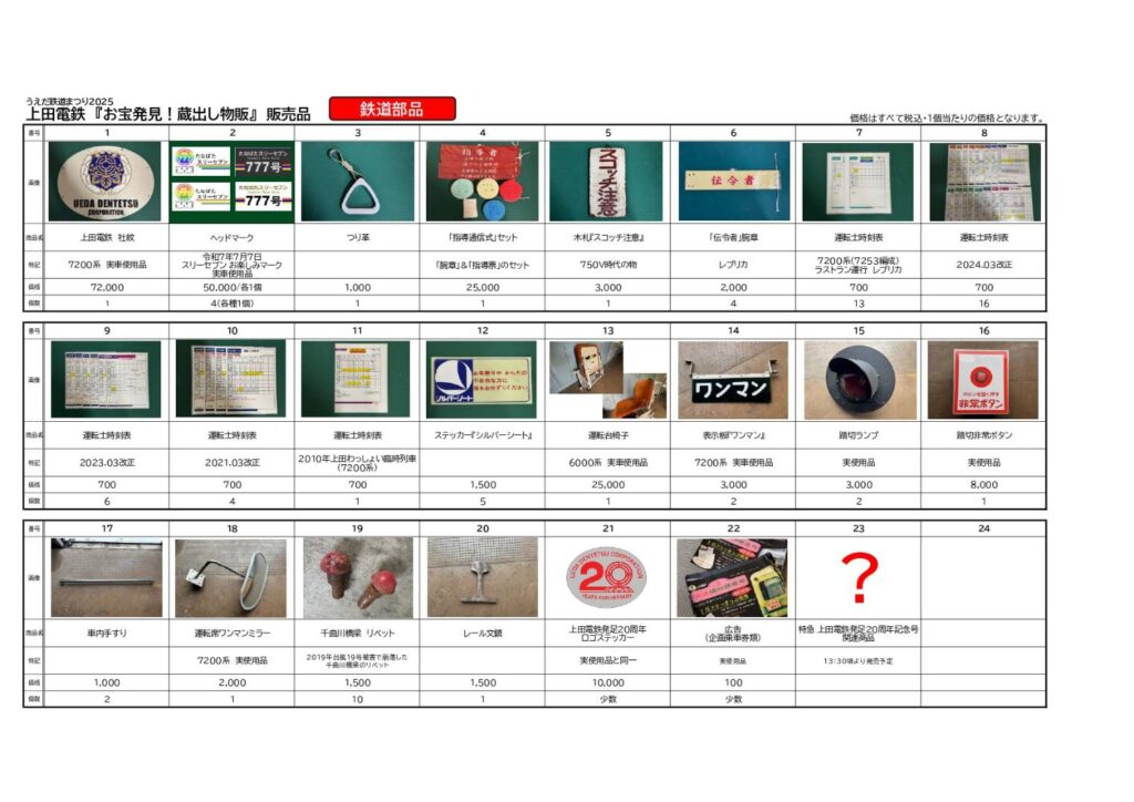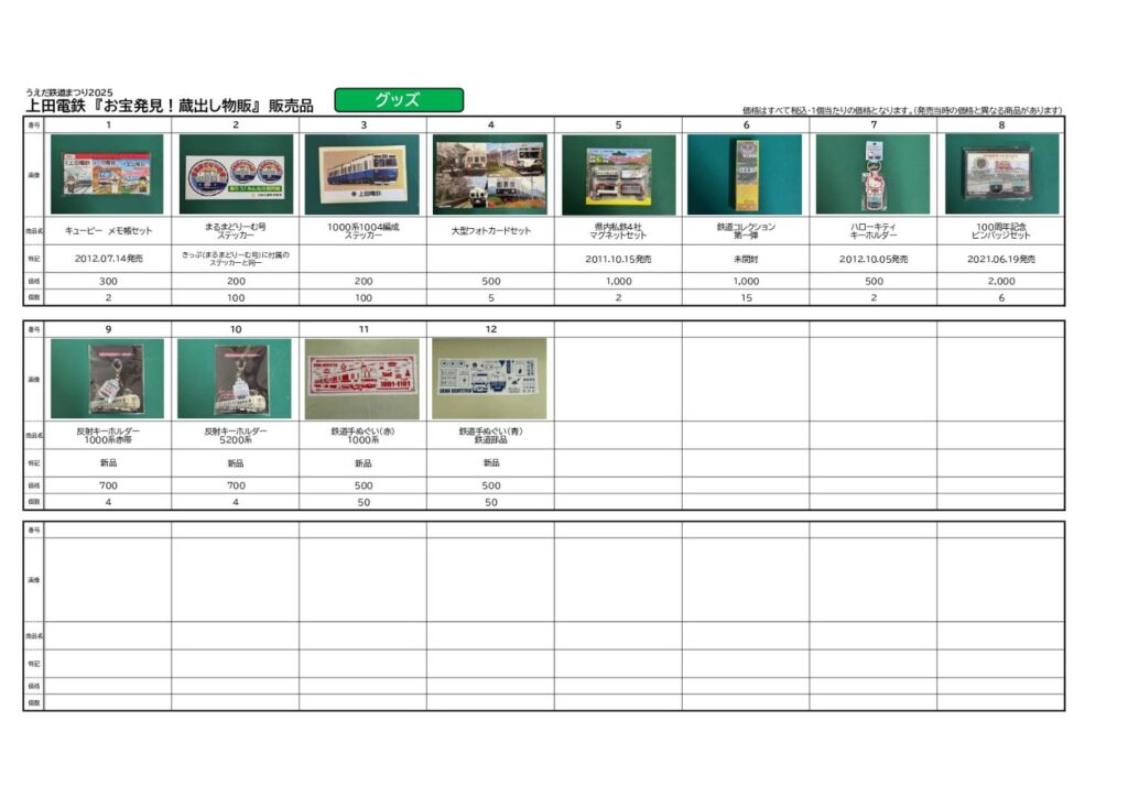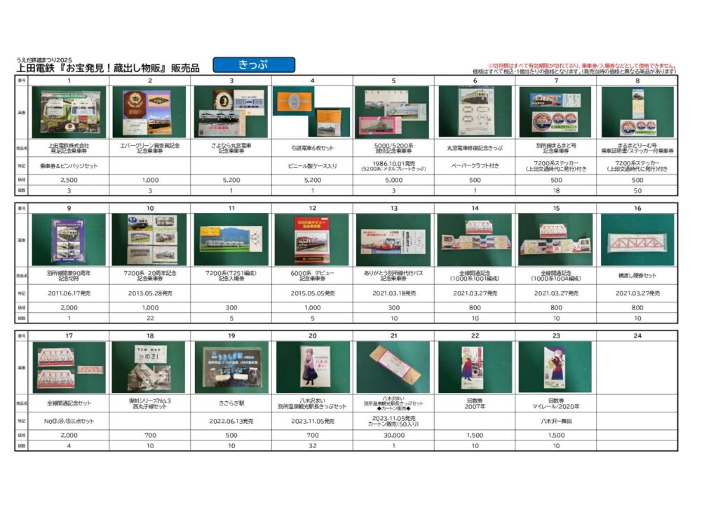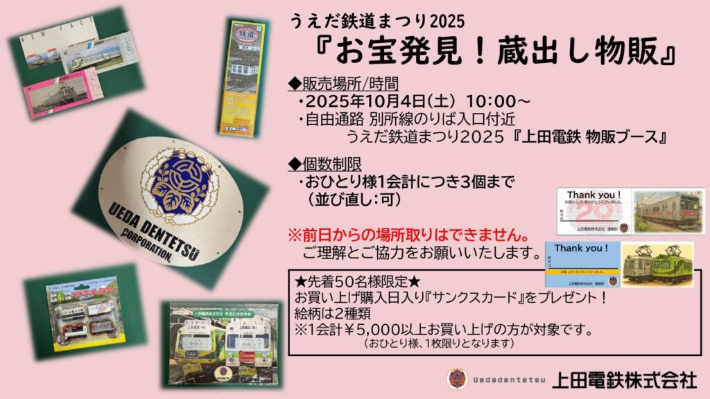 10月4日(土)うえだ鉄道まつりにて販売する乗車券、グッズ一覧です。 弊社のX(旧Twitter)でもご紹介しておりますのでご覧ください。 ※お問い合わせは受け付けておりませんので、当日をどうぞお楽しみに。