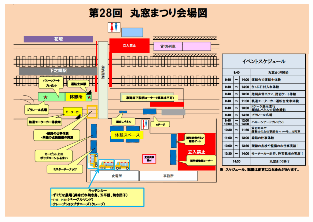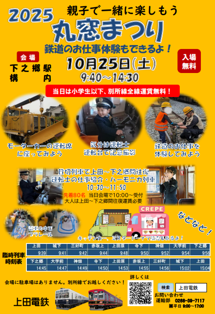 第28回丸窓まつりが開催されます。当日は普段体験できない鉄道のお仕事体験や電車、モーターカー(線路作業列車)の運転席での記念撮影、キッチンカーなどの出店があります。 ◎詳細については、イベントチラシをご覧ください。 ※当日は、別所線全線で小学生以下運賃無料!!是非、ご家族でお越しください。 開催日 2025年10月25日(土曜日) 場 所 別所線下之郷駅構内(車庫) 開催時間 9時40分~14時30分 【お願い】 会場には駐車場がございません。パーク&ライド(大学前駅・中野駅・舞田駅)・別所線電車をご利用ください。