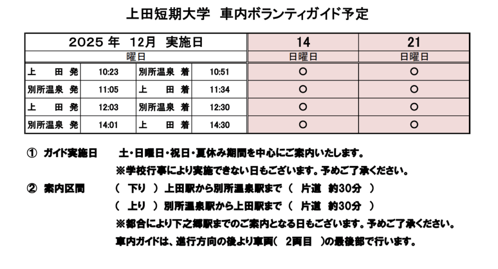 上田短期大学ボランティアガイドの皆さんが別所線沿線の観光スポットや別所温泉の魅力について、ご案内いたします。是非ご乗車ください。 ◎ガイド列車の運行については予定表をご覧ください。 ※都合により、ご案内区間が変更になる場合がございます。予めご了承ください。