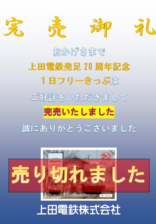 上田電鉄発足20周年記念1日フリーきっぷ完売のお知らせ